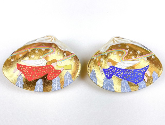 【貝合わせ】Joyful! 平安時代の遊びであった貝合わせを、飾って楽しんで頂ける作品にしました。 喜びで満たされた天使たちを描きました。 蛤に箔をはり、一筆一筆大切に絵付けを施しています。 貝の外面の片側にサインの刻印がございます。 布袋とオリジナルデザインの桐箱付きでお届けいたします。 桐箱の蓋の裏側に手書きのタイトルとサインがございます。 【蛤ひとつあたりのサイズ】横幅7.5cm 縦幅5.7cm 【使用画材】真鍮箔 岩絵の具 ポスターカラー お支払い確認後、3日以内に発送いたします。