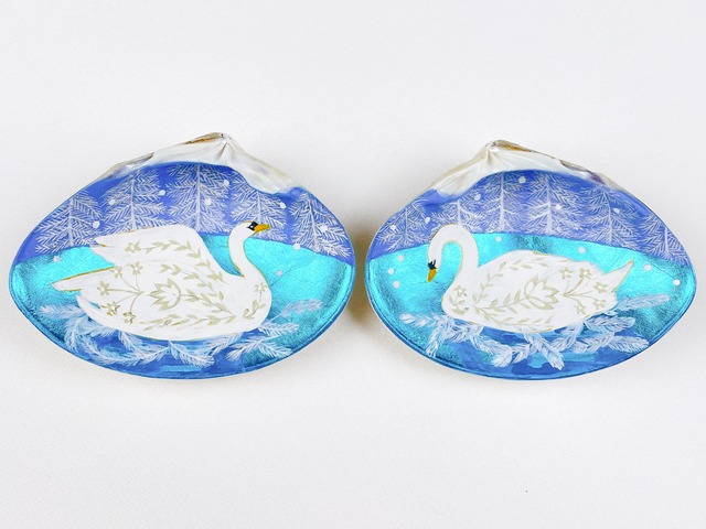 【貝合わせ】雪の日のスワン 平安時代の遊びであった貝合わせを、飾って楽しんで頂ける作品にしました。 雪の日の湖にしずかに浮かぶコブハクチョウを描きました。 蛤に箔をはり、一筆一筆大切に絵付けを施しています。 貝の外面の片側にサインの刻印がございます。 布袋とオリジナルデザインの桐箱付きでお届けいたします。 桐箱の蓋の裏側に手書きのタイトルとサインがございます。 【蛤ひとつあたりのサイズ】横幅7.6cm 縦幅5.7cm 【使用画材】新光箔 岩絵の具 ポスターカラー お支払い確認後、3日以内に発送いたします。