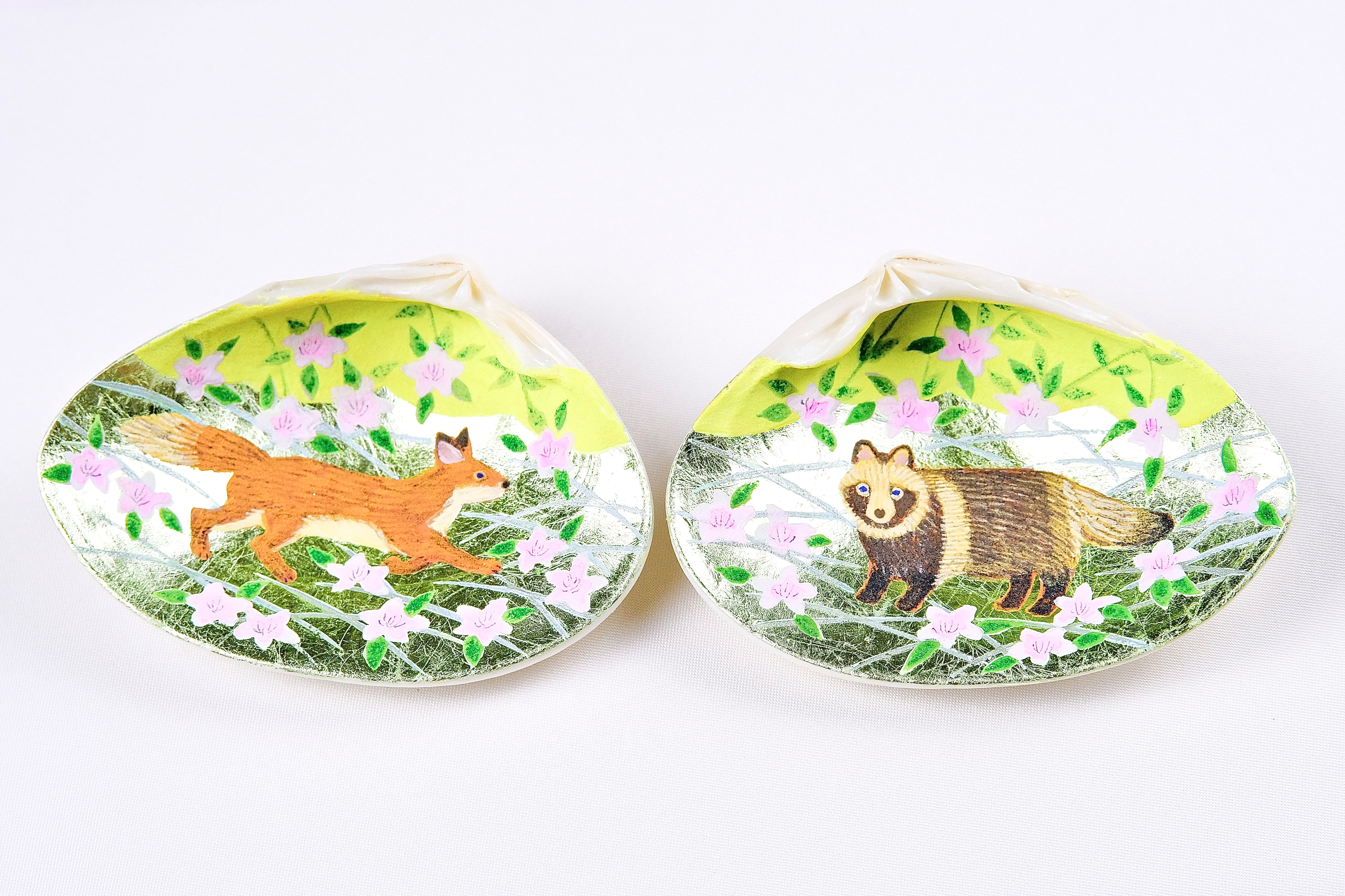 状態の良い蛤に優しいグリーンの箔をはり、一筆一筆日本画材料で大切に絵付けを施しています。