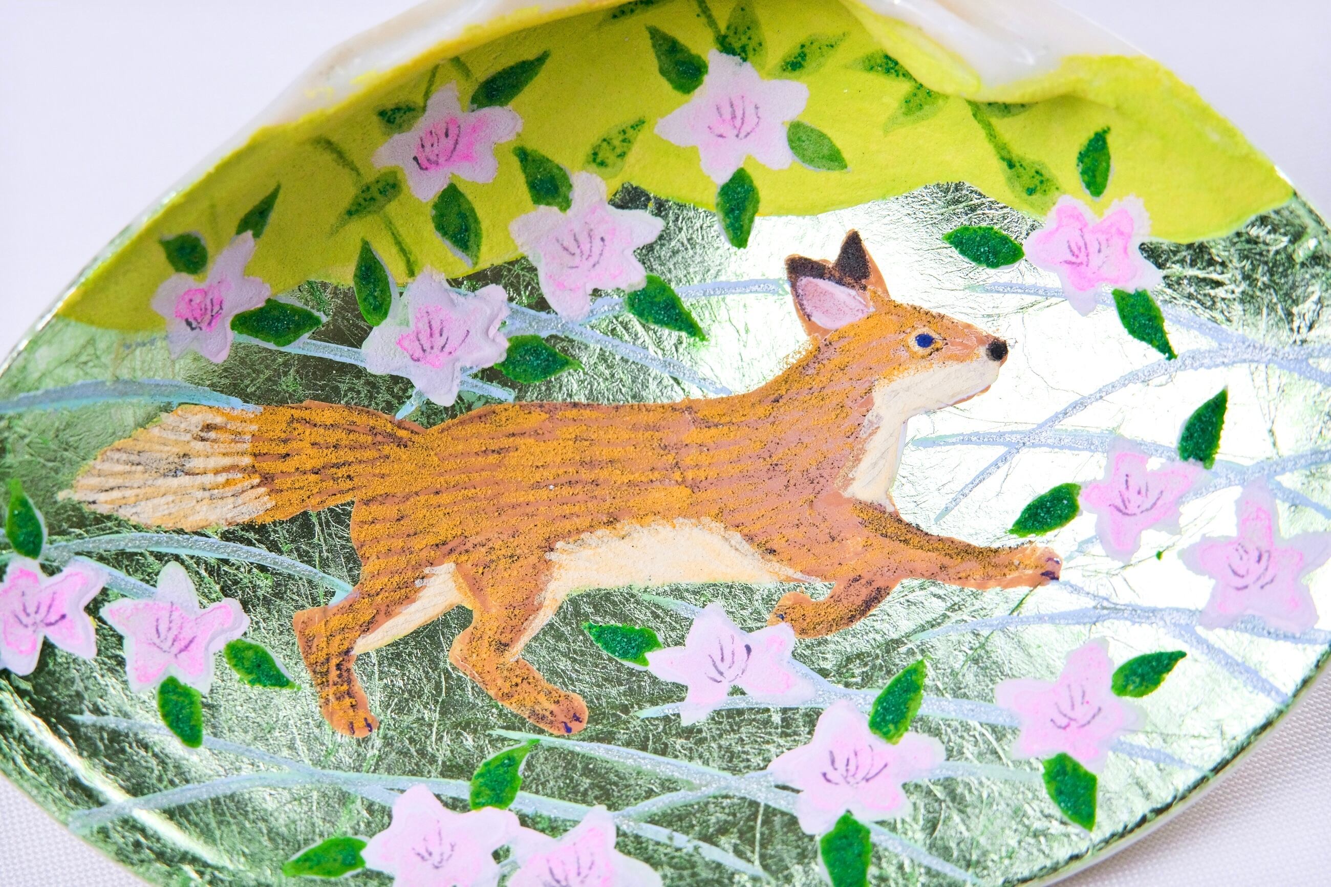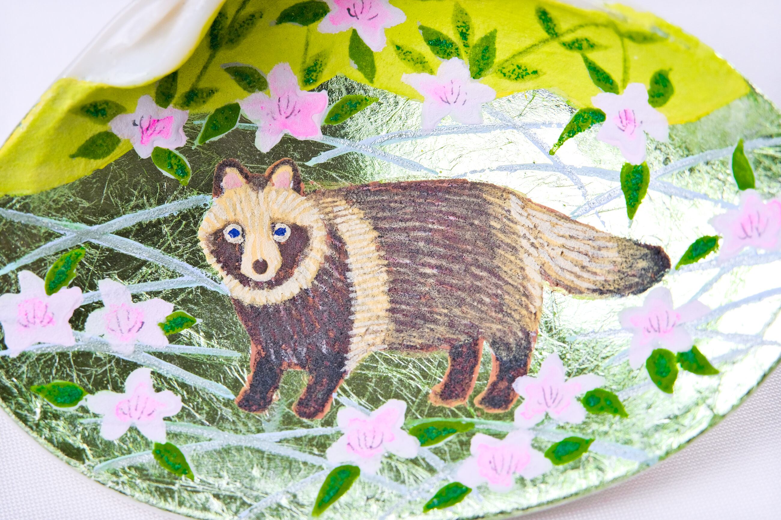 愛媛県に生育するトキワバイカツツジと、里山を生きるキツネとタヌキの姿を描きました。