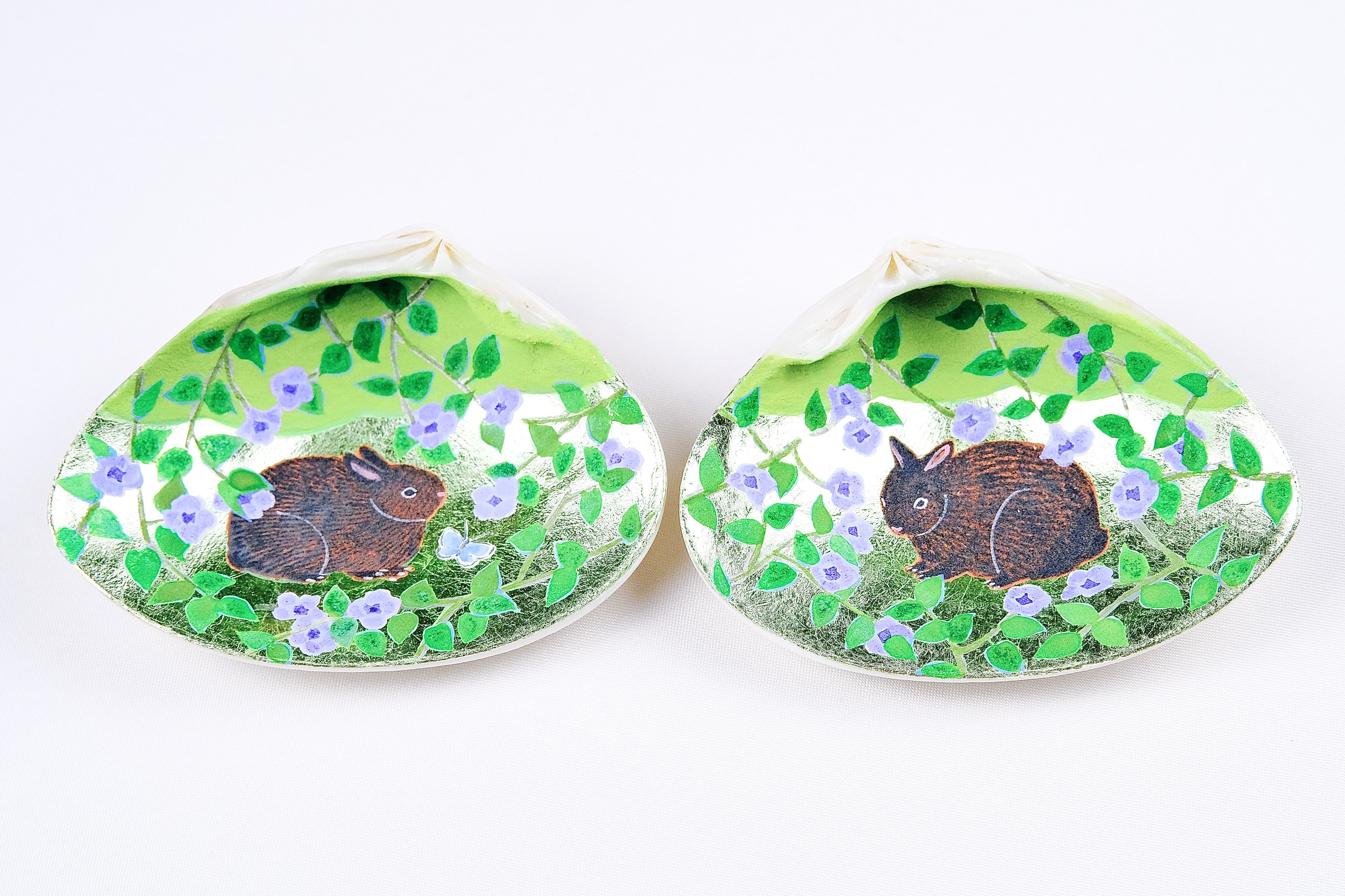 状態の良い蛤に優しいグリーンの箔をはり、一筆一筆日本画材料で大切に絵付けを施しています。