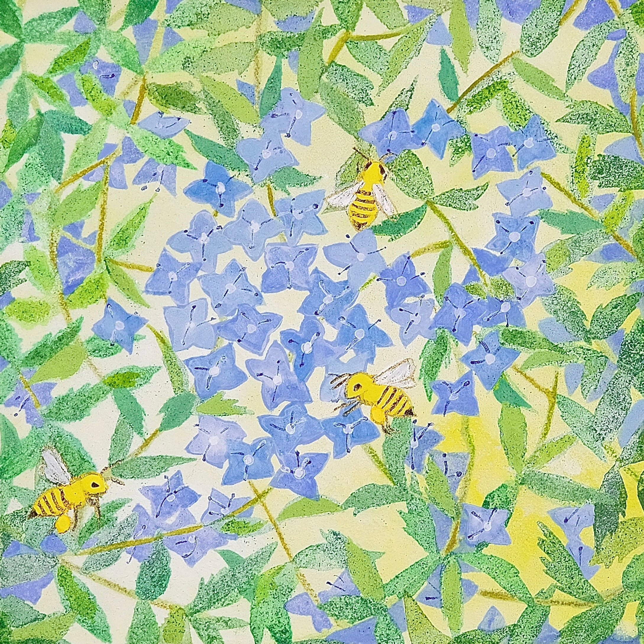 花の蜜を熱心に集めるミツバチたちの姿を描きました。