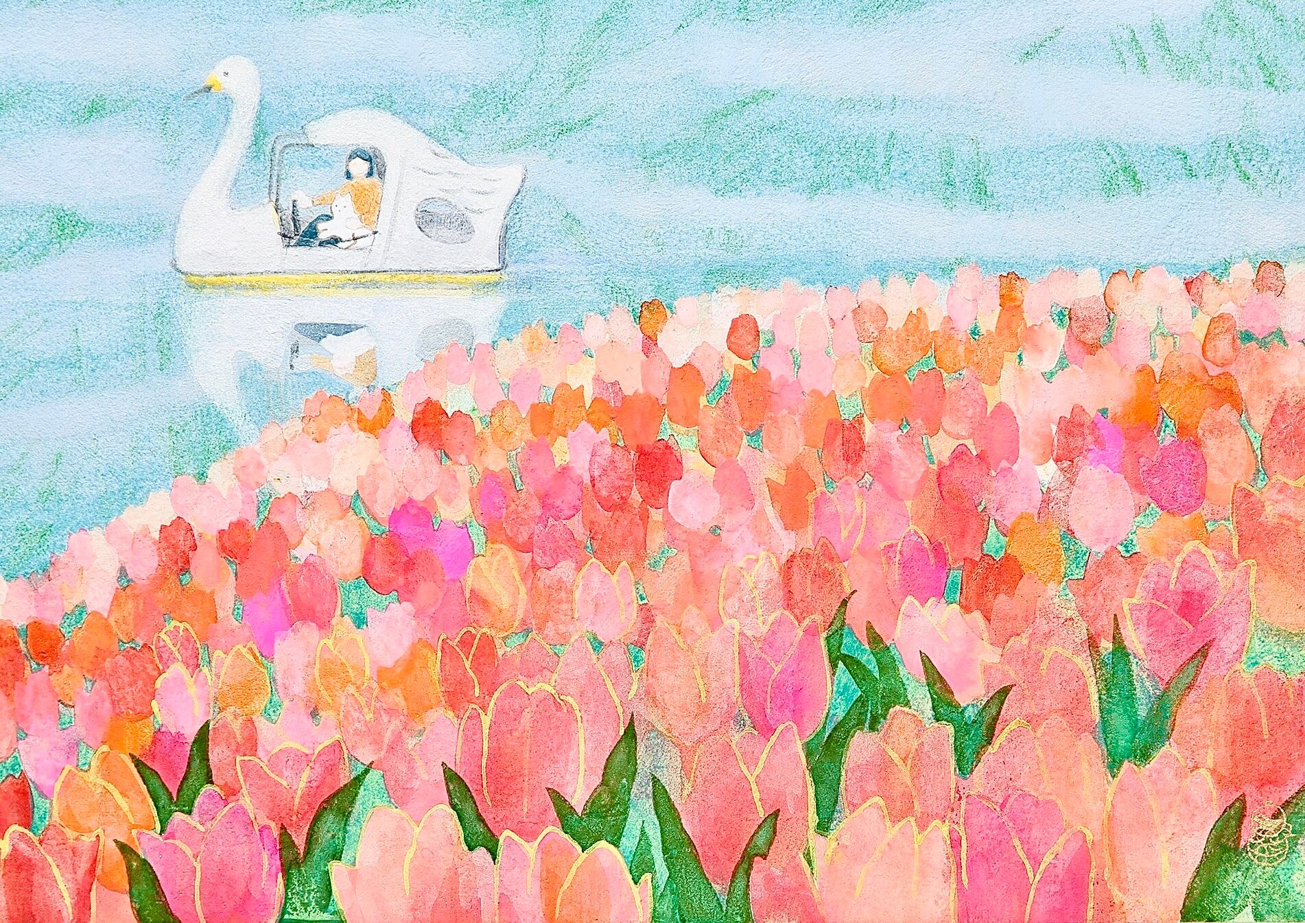 鮮やかに咲くチューリップ畑の側を、スワンボートがのんびりと進んで行く様子を描きました。
