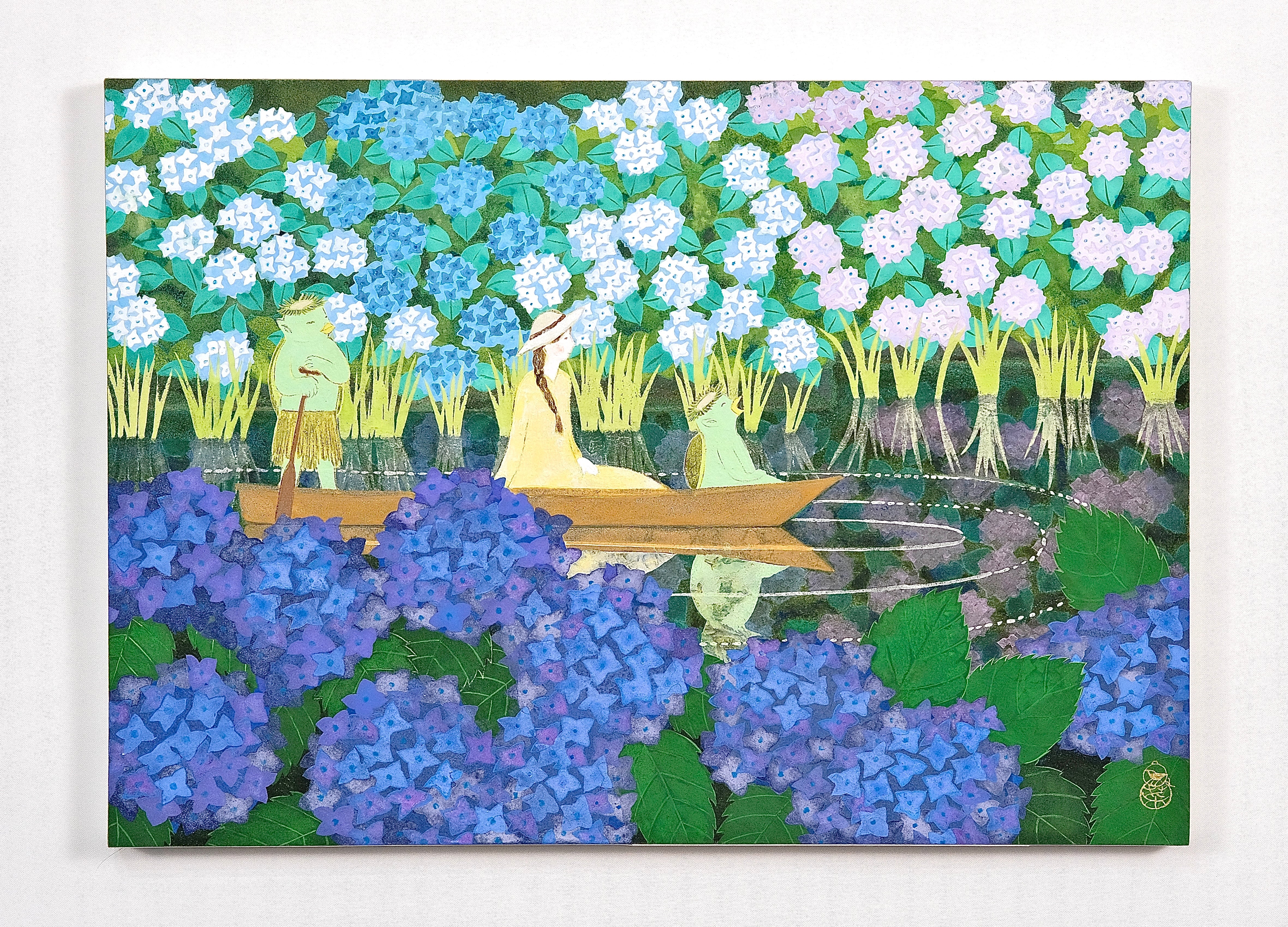 紫陽花の咲く水辺を、河童の船頭さんたちが楽しげに案内する様子を描きました。